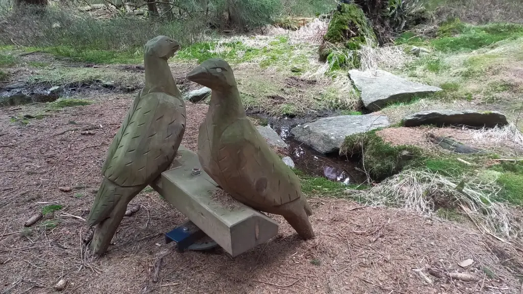 Došli jsme k prameni potoka Taubenbrunn, kde Němci umístili pěknou dřevořezbu dvou holoubků. Vyplašili jsme jednoho tetřeva.